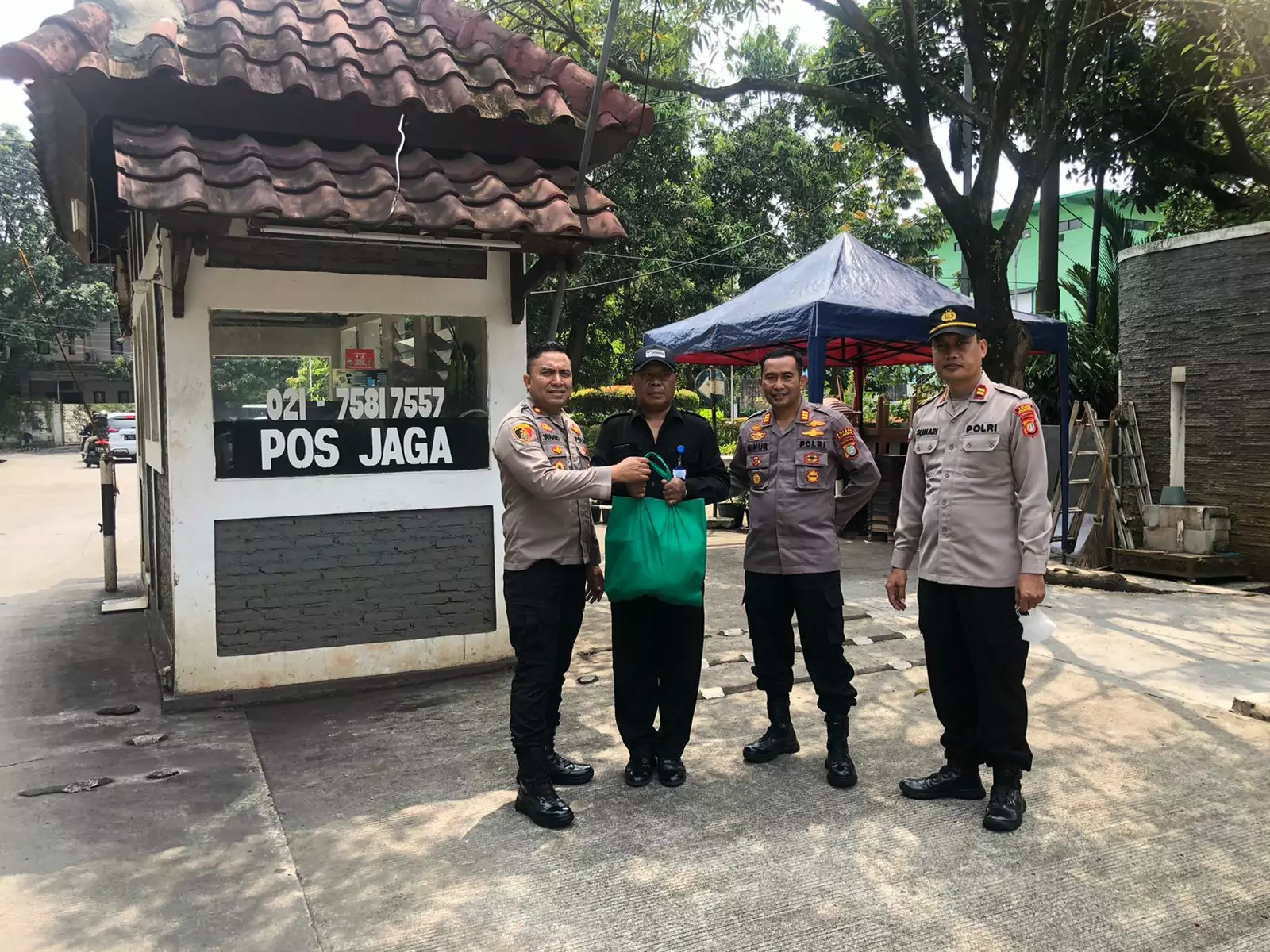 Pos yang berlokasi di RT 01/01 tersebut dijaga oleh beberapa satpam perumahan yang sebagian warganya mudik lebaran ke berbagai daerah.