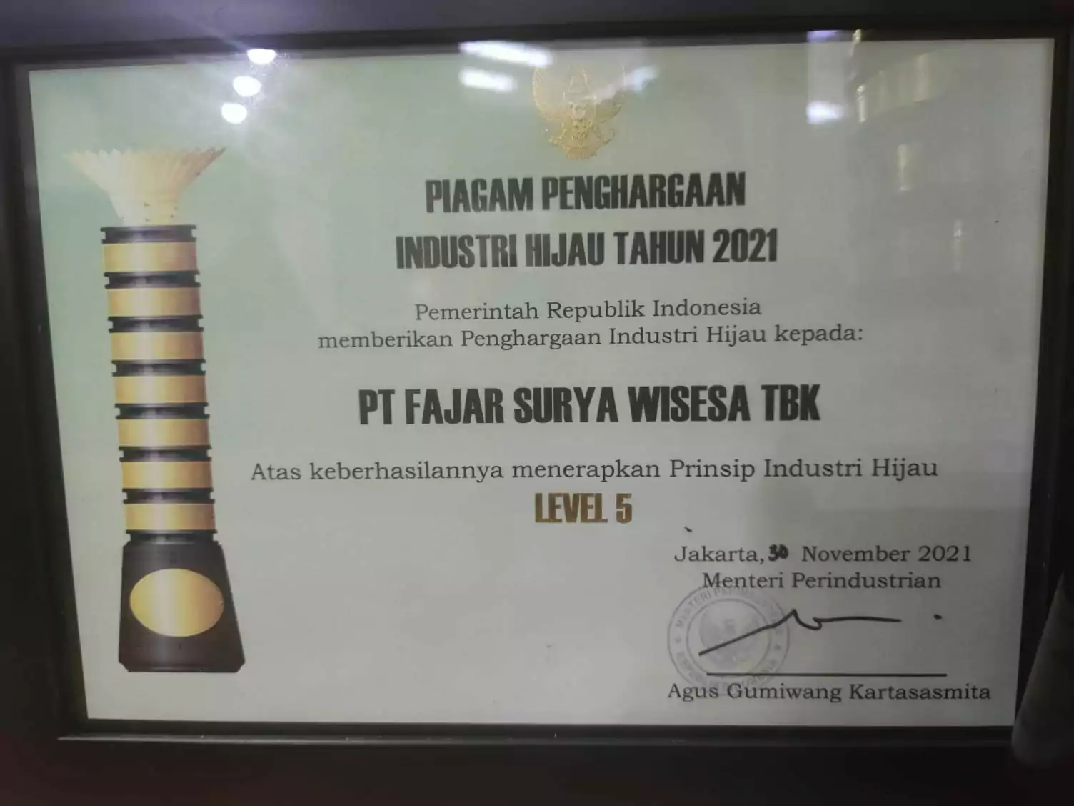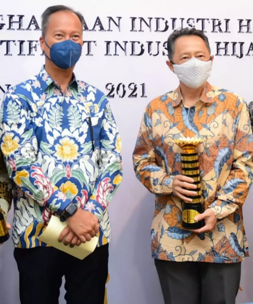 Penyerahan penghargaan dilakukan Menteri Perindustrian Agus Gumiwang Kartasasmita kepada perwakilan Direksi Fajar Surya Wisesa Thomas Kosim di Jakarta, Selasa (30/11/2021).